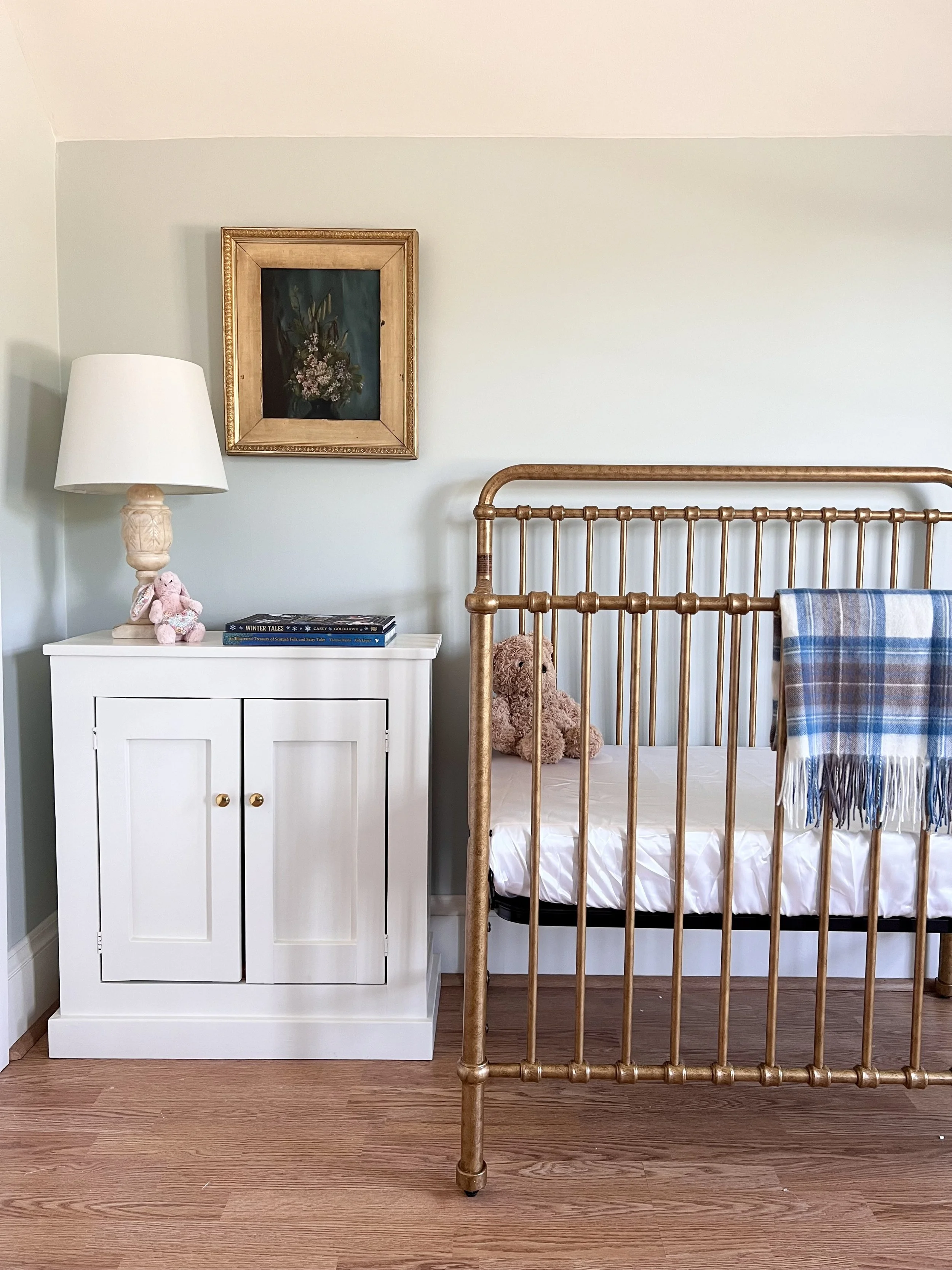 I ended up painting the room Quite Moments by Benjamin Moore. It was part of the Benjamin Moore Color Trends Palette in 2022. That was after Covid when green was such a popular color. It’s such a beautiful blue green gray color and I wanted to use it somewhere. I really love the color with her brass mini crib.